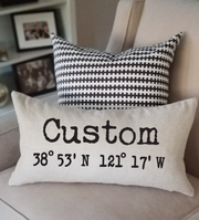Our best selling design, perfect for smaller spaces. It is a 12x22" cotton/linen blend cover, down insert included. You select the name/ location! We'll gather the coordinates when you give us an area, or even an exact address. If you list a neighborhood or town, we'll select coordinates for the main or center area. Sometimes there is a significant landmark and we'll use those coordinates! Customer orders can take 10-14 days to complete.